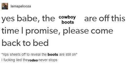big ol butt. cowboy slut. looking at spurs, makes me nut. leather boots, assless chaps. give my big, butt a slap. and now you know, the cowboy rap.